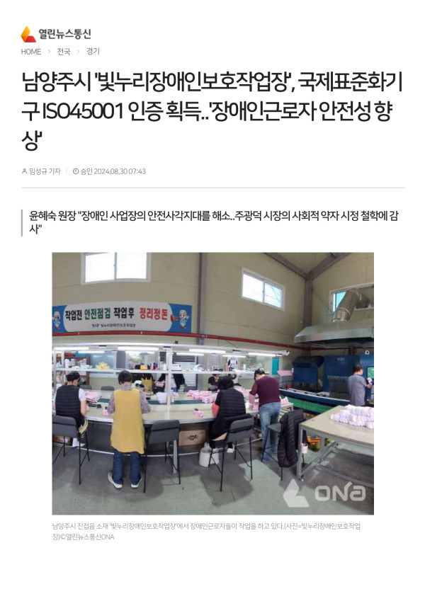 [회원시설] 장애인 사업장의 안전사각지대 해소, 윤혜숙 원장(빛누리장애인보호작업장) ISO45001 획득 [2024-08-30… 관리자 0 214 01.08 16:55 https://www.onews.tv/news/articleView.html?idxno=217665