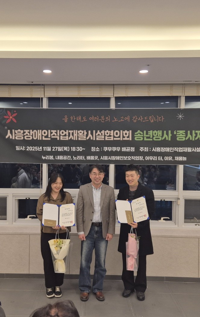 시흥시장애인직업재활시설협회의회 송년행사 '종사자의 밤' 최고관리자 0 145 01.08 16:06 2025년 11월 27일 18시 30분 회장님께서는 시흥장애인직업재활시설협의회 송년행사인 '종사자의 밤'에 참여하셨습니다.행사에서는 한 해 동안 각 시설에서 맡은 역할을 성실히 수행해 온 종사자들의 노력을 기리기 위해 표창 시상이 진행되었으며회장님께서 직접 수상자들에게 축하의 뜻을 전하셨습니다.