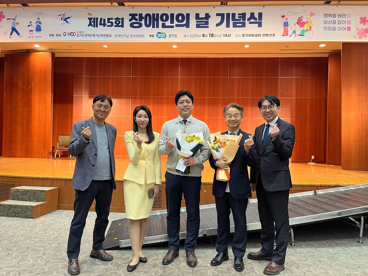 경기도장애인복지단체연합회 제45회 장애인의날 기념식 참여 (4.21) 경직협 0 313 01.08 16:06 경직협 임효순 회장은 지난 4월 21일 경기아트센터 컨벤션홀에서 개최된 경기도장애인복지단체연합회 제45회 장애인의날 기념식에 참석하여 장애인과 함께 하는 시간을 보냈습니다. 더불어 협회 회원시설 표창 수상자들의 수상을 축하하며 함께 기뻐하였습니다. 당일 수상자이신 푸른동산보호작업장 김정환 사무국장님(복지유공자 경기도지사상), 고양시구산동장애인직업재활원 홍성웅 부장님(복지부장관상),부천시장애인직업재활시설 이영윤님(모범장애인 경기도지사상), 다시 한번 축하드립니다.