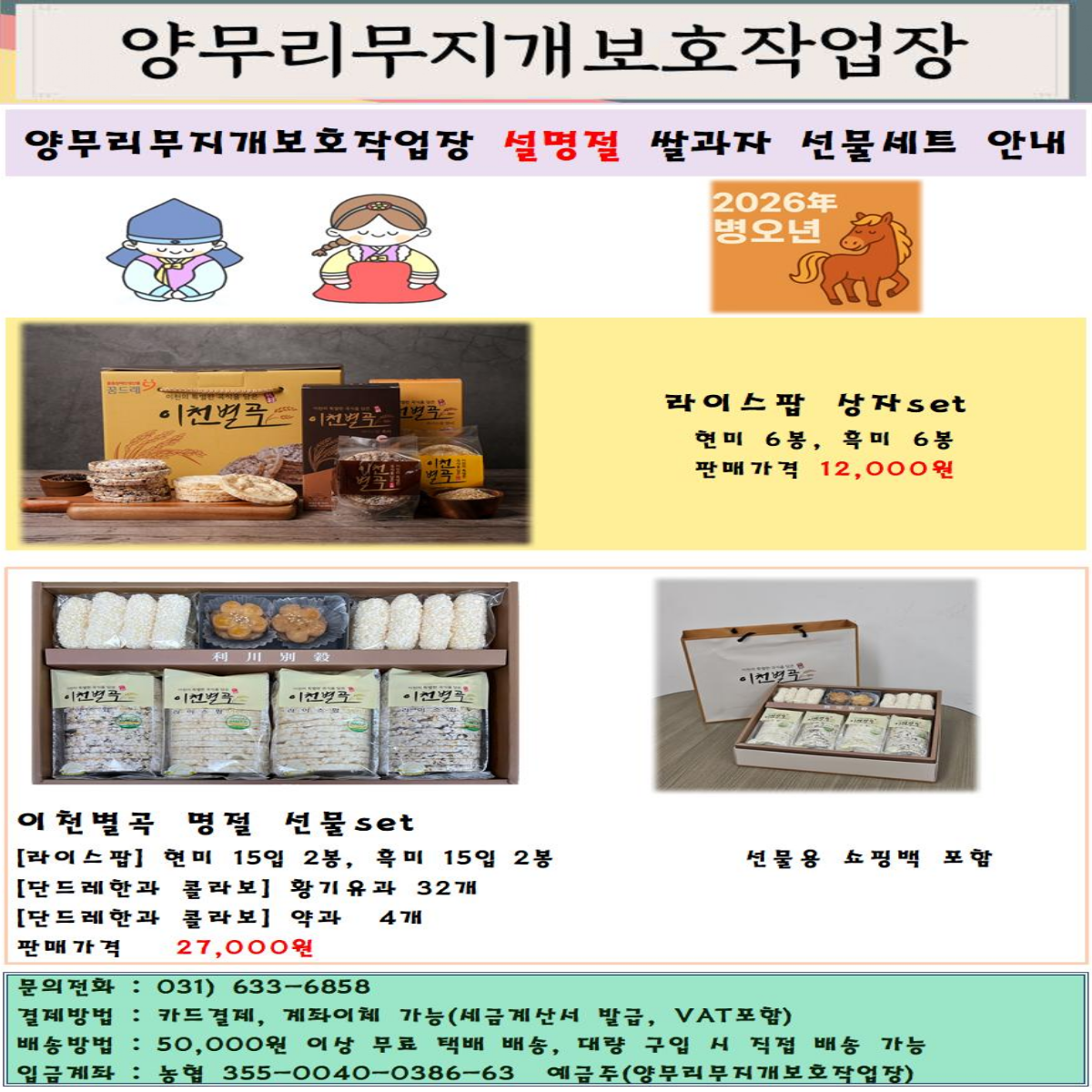 2026년 설 명절 선물세트 판매(2탄) 경직협 0 107 02.06 10:51 2026년 설 명절,정성이 담긴 선물로 마음을 나눠보세요.경직협 회원시설에서 준비한 선물세트는받는 분께는 기쁨을 만드는 분께는 응원이 되는 의미 있는 설 명절 선물로일상의 실용함과 따뜻한 의미를 함께 담았습니다